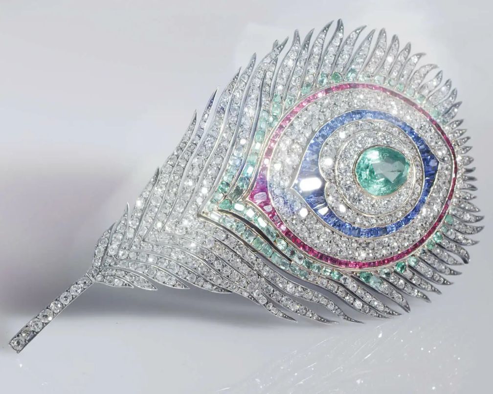 Эта брошь в виде павлиньего пера, шедевр Mellerio, выполненная из серебра на золоте и украшенная бриллиантами, рубинами, сапфирами и изумрудами, была приобретена императрицей Евгенией Бонапарт в 1868 году. Дизайн может трансформироваться, что позволяет носить ее как подвеску (любезно предоставлено Mellerio):