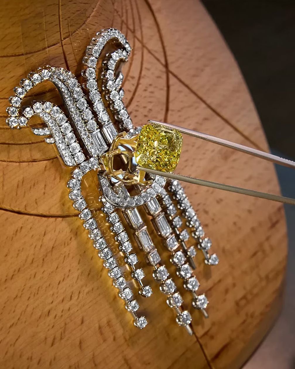 Коллекция сочетает в себе римское наследие Дома с современным мастерством исполнения, демонстрируя поразительный выбор драгоценных камней и потрясающее колье Eaux d’Artifice centennial с фантазийным ярко-желтым бриллиантом безупречной чистоты, весом 20,25 карата:
