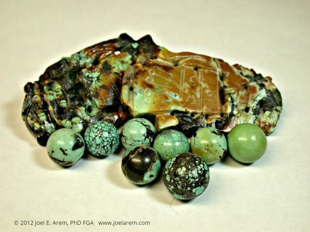 Резьба по бирюзе и бусины, Китай (фото Joel E. Arem):
