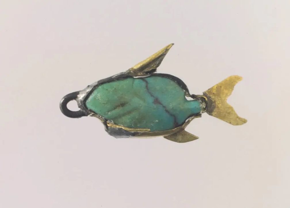 Подвеска в виде рыбы (изображение «перевернутого сома», обладающего магическими свойствами), золото и бирюза. Среднее царство, Египет, около 1878-1749 гг. до н.э. (Метрополитен-музей, Нью-Йорк):