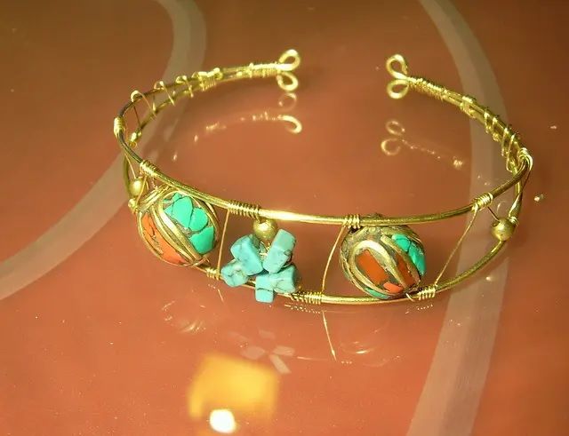 Тибетский браслет из латунной проволоки с коралловыми и бирюзовыми бусинами (фото Ines de Colorínes):
