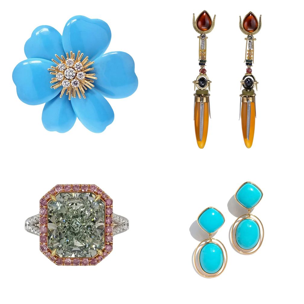 По часовой стрелке: брошь Van Cleef & Arpels Rose De Noël, сережки Michael Boyd Studio, сережки Tamsen Z Sleeping Beauty Turquoise и кольцо с бриллиантом Scarselli: