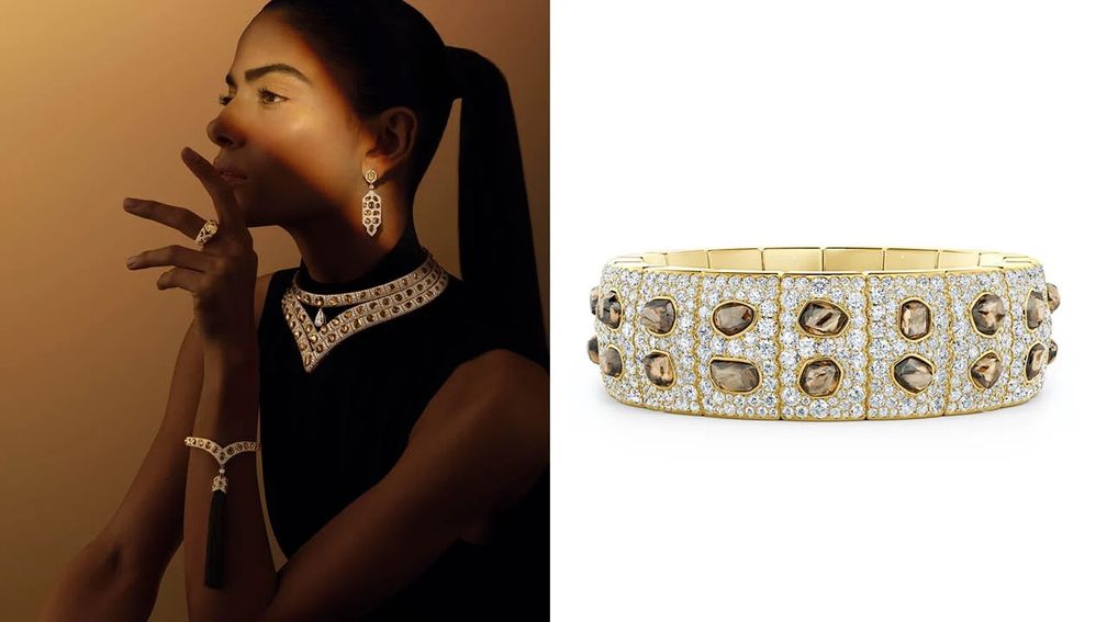 Сет украшений с коричневыми бриллиантами (слева) и браслет с коричневыми бриллиантами из коллекции ювелирных украшений Forces of Nature от De Beers (De Beers):