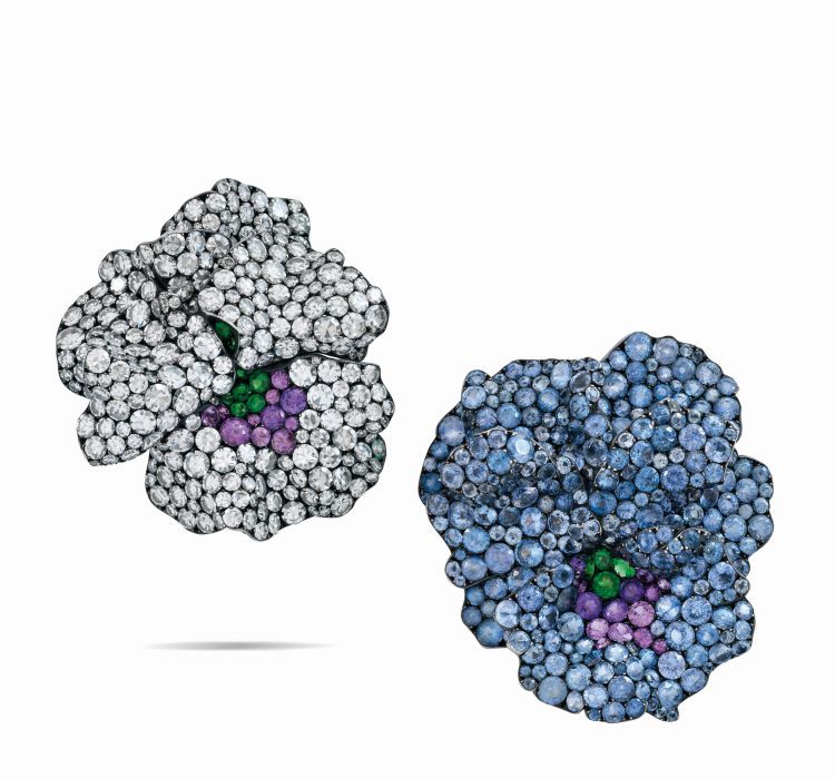 Серьги JAR Pansy с круглыми сапфирами различных оттенков, аметистами, изумрудами и бриллиантами (Christie’s Images Limited):