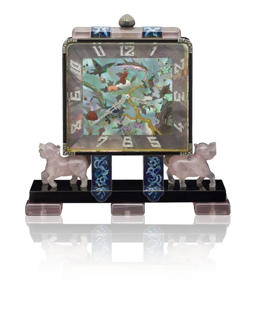 Настольные часы в стиле шинуазри, механизм фирмы Verger и маркетри Владимира Маковского от Lacloche Frères (1925):