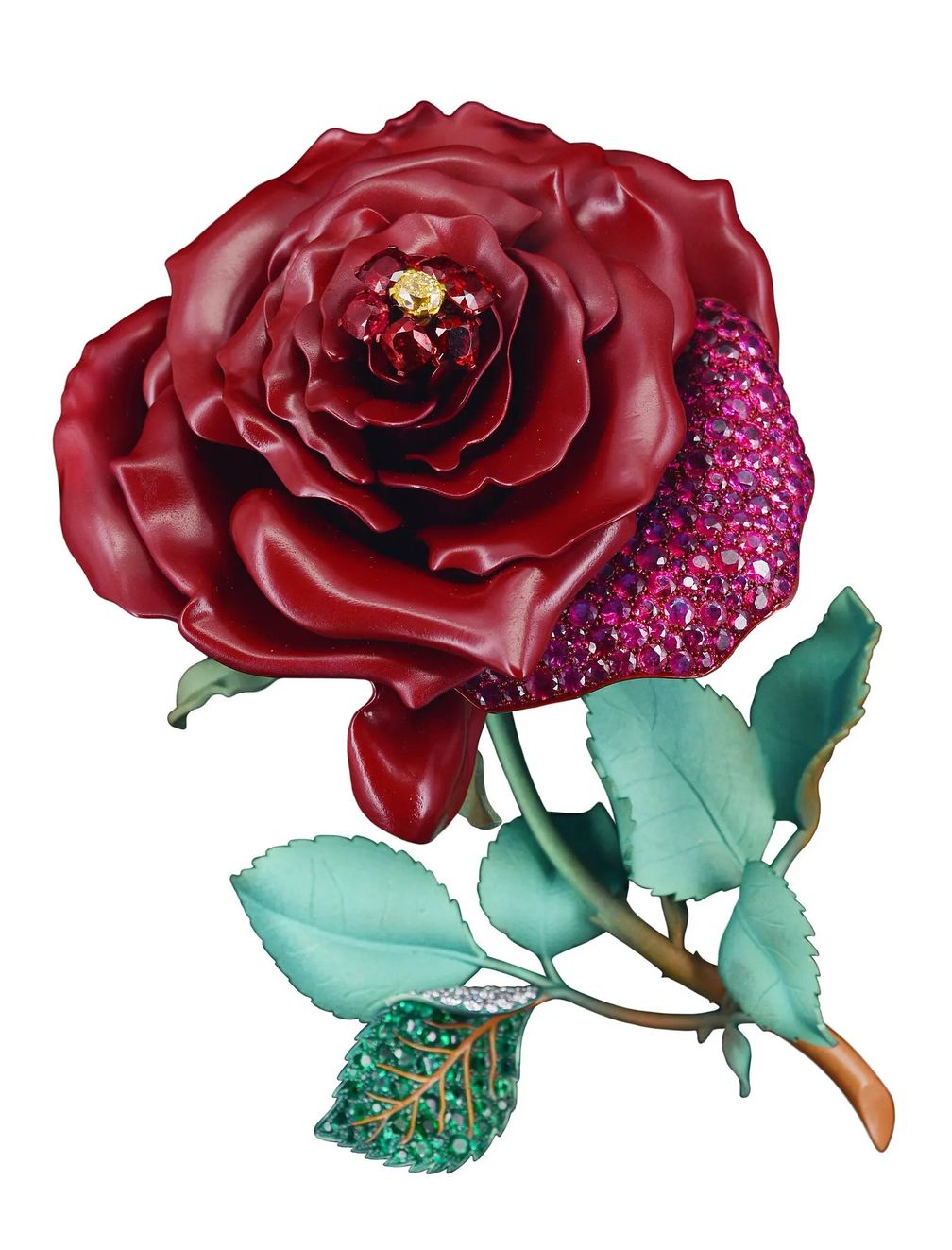 La Rose Gracieuse от Анны Ху – реалистичная брошь с центральным фантазийным желтым бриллиантом и лепестками, инкрустированными 229 рубинами: