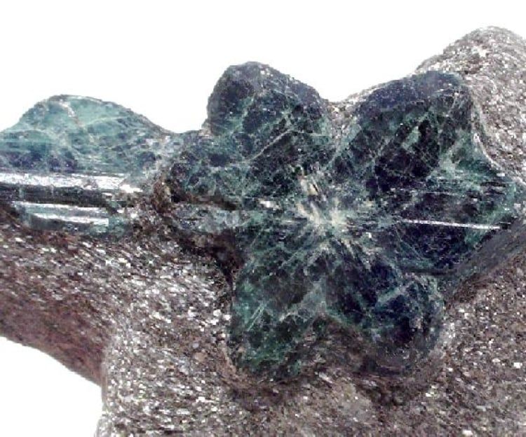 Эти александриты на матрице биотитовых сланцев из Бразилии демонстрируют изменение цвета от зеленого до «аметистового» (© Rob Lavinsky):