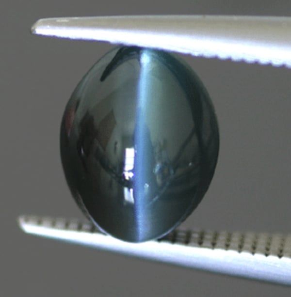 Этот овальный александрит-кабошон демонстрирует исключительную цветовую гамму и напоминает «кошачий глаз». Цветовая гамма от темно-сине-зеленого до фиолетового охватывает около 80 % — 85 % драгоценного камня, Андхра-Прадеш, Индия (© The Gem Trader):