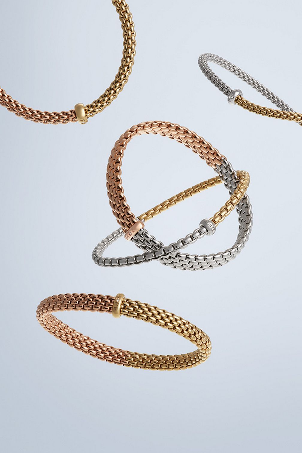 Как бы то ни было, нашим клиентам нравится сочетать разные модели браслетов, поэтому в прошлом году мы выпустили коллекцию двухцветных браслетов. Это дополнение к их образу. Хорошо, что вам не обязательно придерживаться стиля Fope. Мы становимся дополнением к вашему стилю, и это то, чем мы хотим быть.