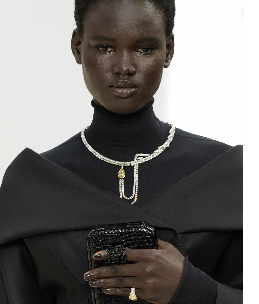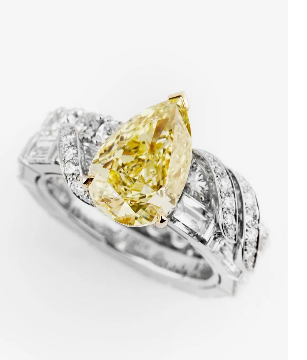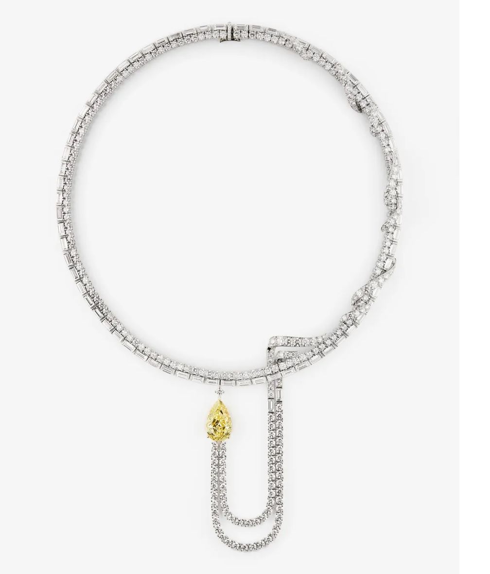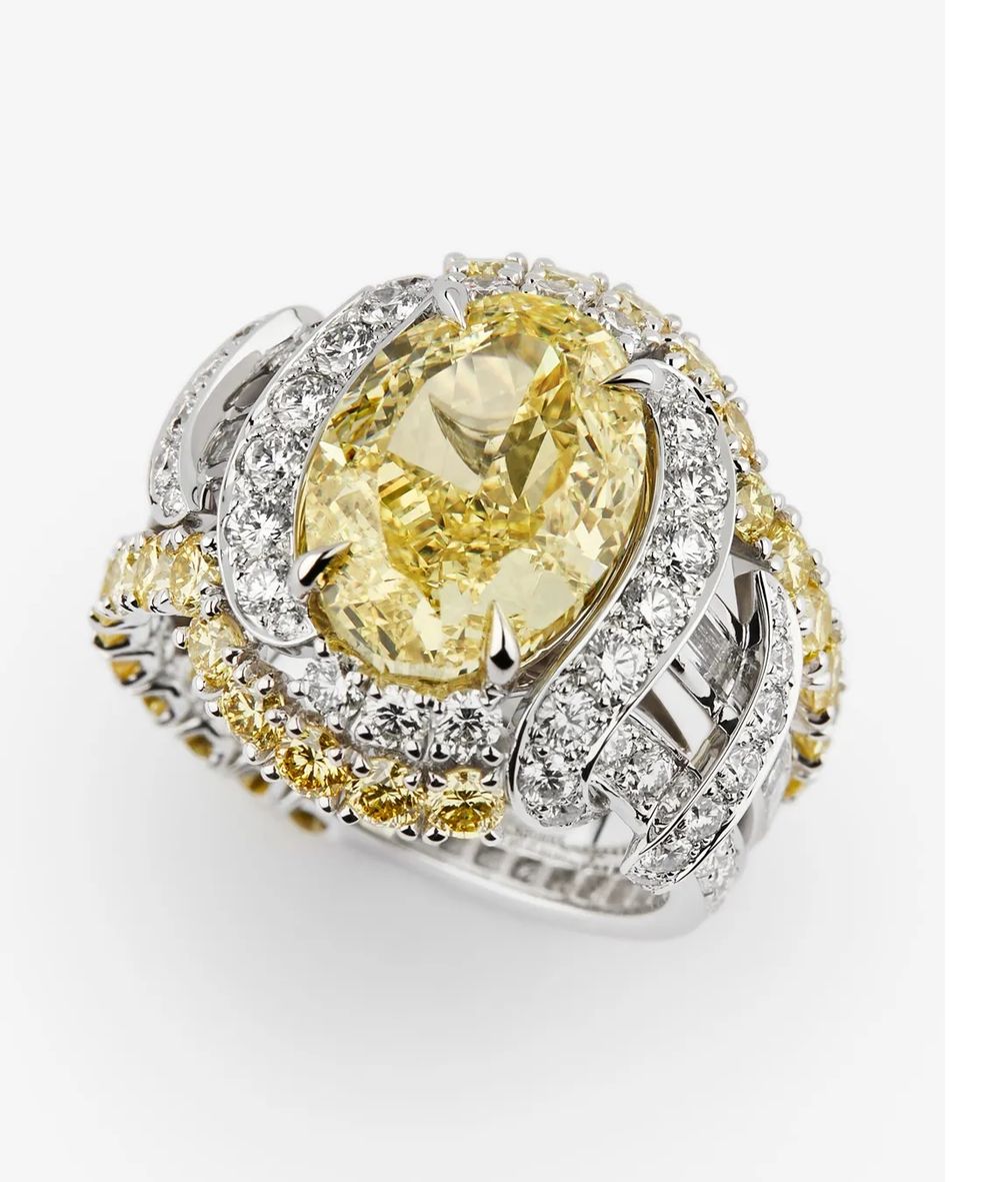 О первом проекте Делеттре Фенди для Fendi в стиле haute joaillerie стало известно в прошлом году: Fendi Flavus, парюра, состоящая из трех частей, включая каскадное колье, серьги и коктейльное кольцо с четырьмя природными бриллиантами фантазийного ярко-желтого цвета, наполненная глубоким смыслом.