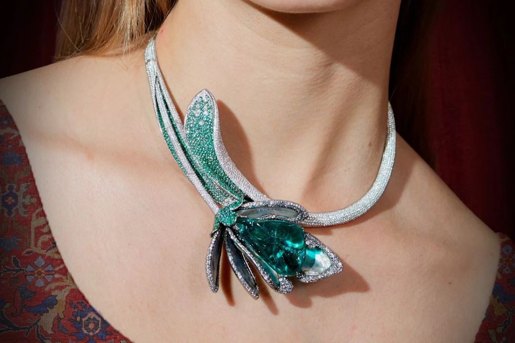 Некоторые из украшений Vuitton создают ощущение trompe l’oeil, а ряды бриллиантов имитируют структуры двойной спирали ДНК. А Boucheron изготавливает чокеры-воротники из горного хрусталя, что придает ожерельям вид вязаных шерстяных изделий или чего-то столь же приятного на ощупь.