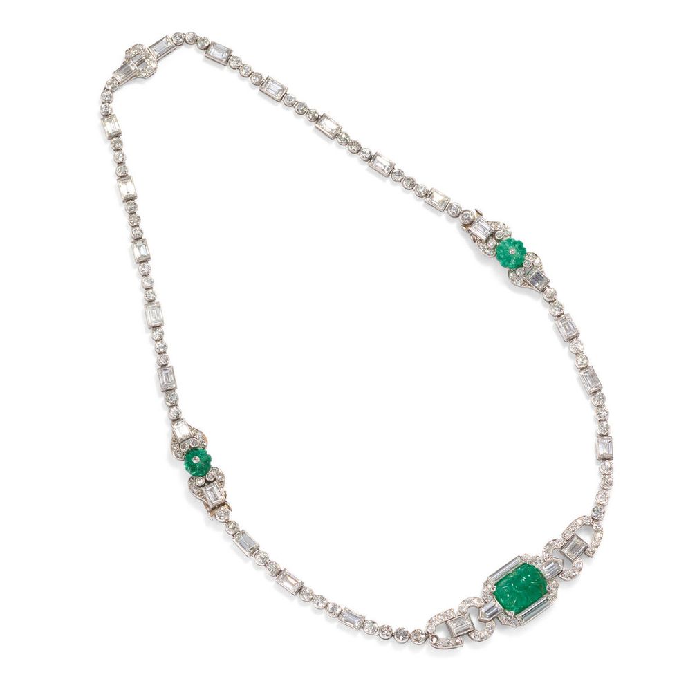 Ожерелье (около 1925 года), трансформируемое в два браслета, из платины с резным изумрудом огранки кабошон, двумя резными изумрудными бусинами и бриллиантами старой европейской огранки. Предварительная оценка: 5500–7500 долларов США: