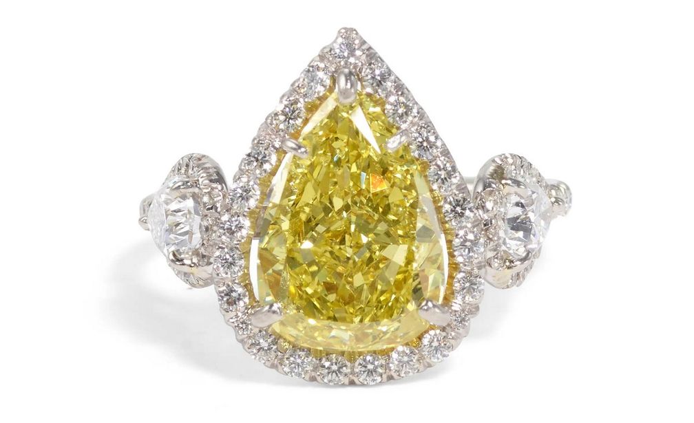 Кольцо из платины с насыщенно-желтым бриллиантом грушевидной огранки 4,19 карата, круглыми бриллиантами и бриллиантами грушевидной огранки. Предварительная оценка: 25 000–35 000 долларов США: