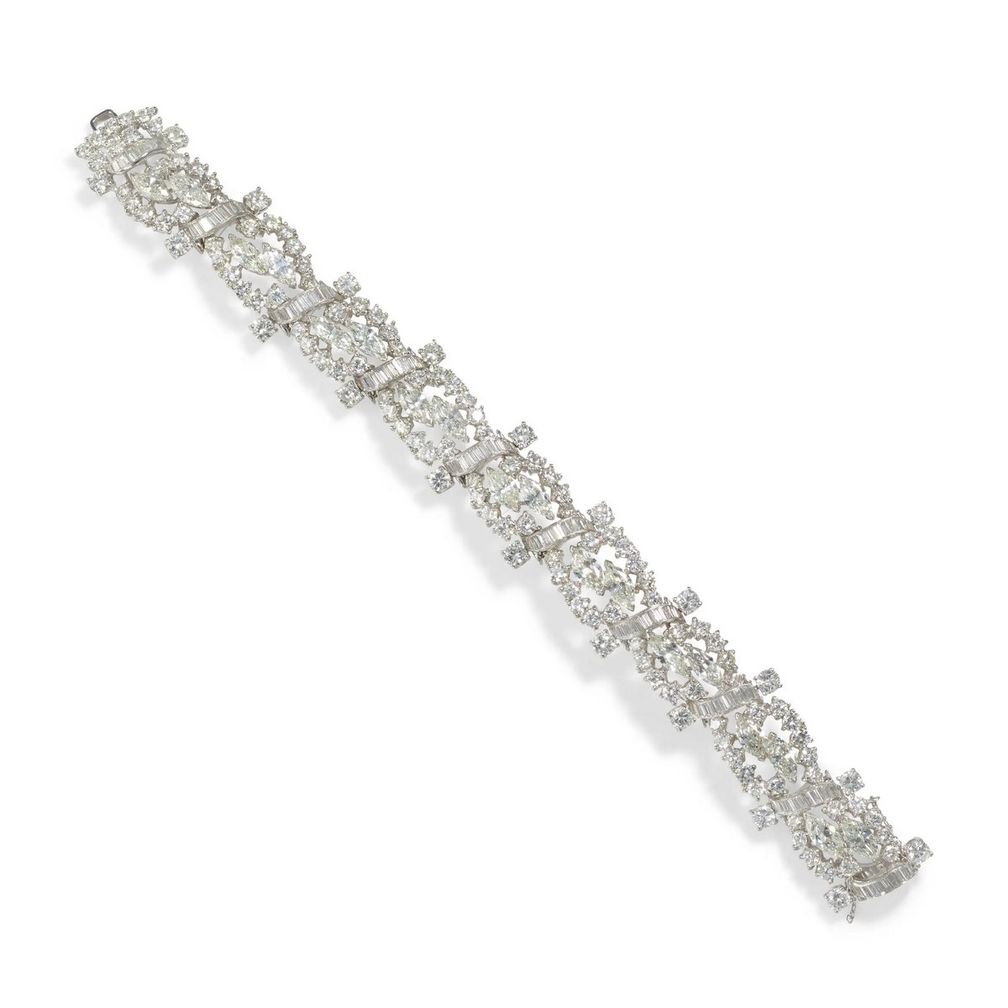 Браслет из платины с бриллиантами круглой, конической багетной огранки и огранки маркиз общим весом около 28,9 карата. Предварительная оценка: 20 000–30 000 долларов США: