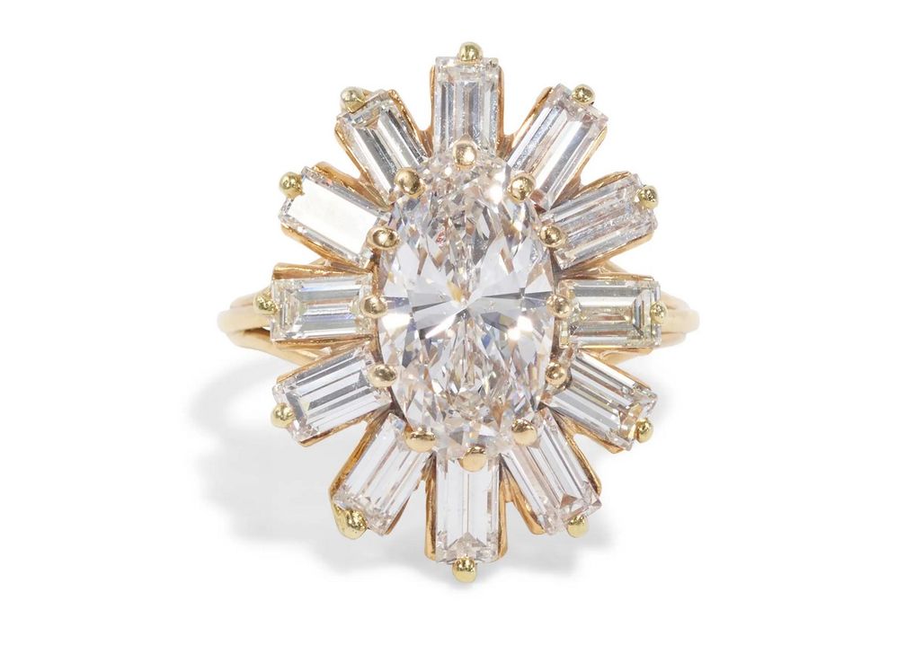 Кольцо (около 1950 года) из золота с овальным бриллиантом 3,05 карата и бриллиантами багетной огранки. Предварительная оценка: 15 000–25 000 долларов США: