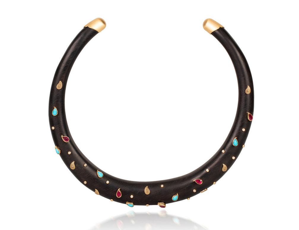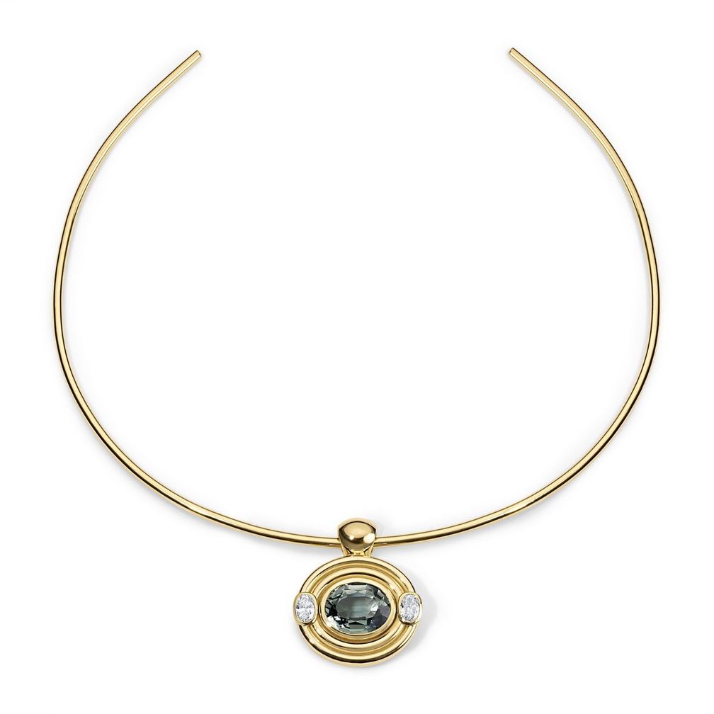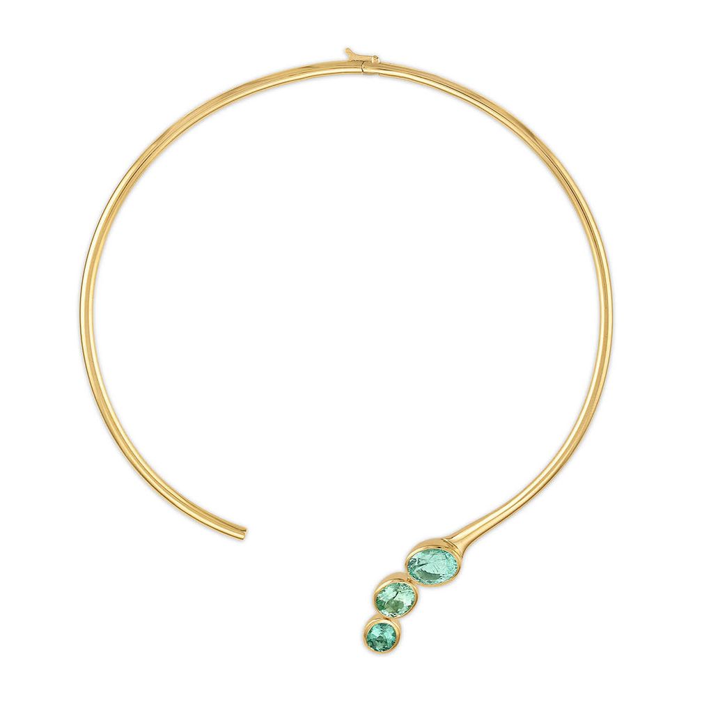 Колье-торки от Джейд — еще один пример. У нее тонкие модели, на которые нанизываются подвески с крупными драгоценными камнями. Другой торк украшен тремя изысканными овальными турмалинами параиба.