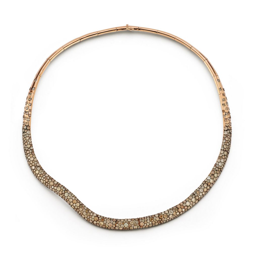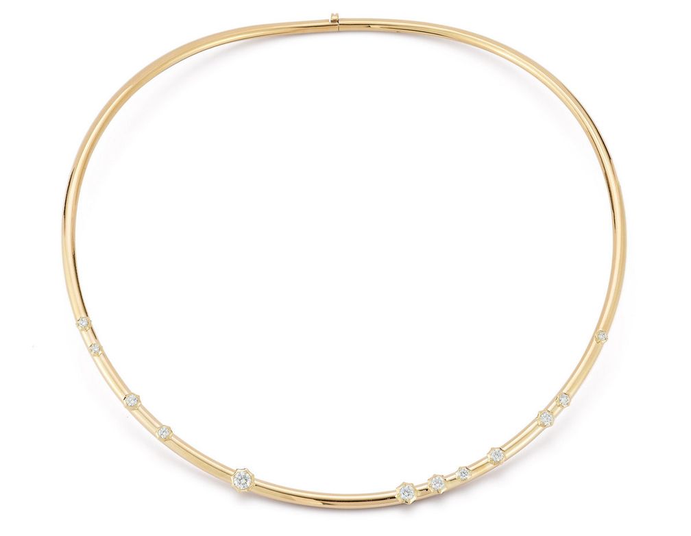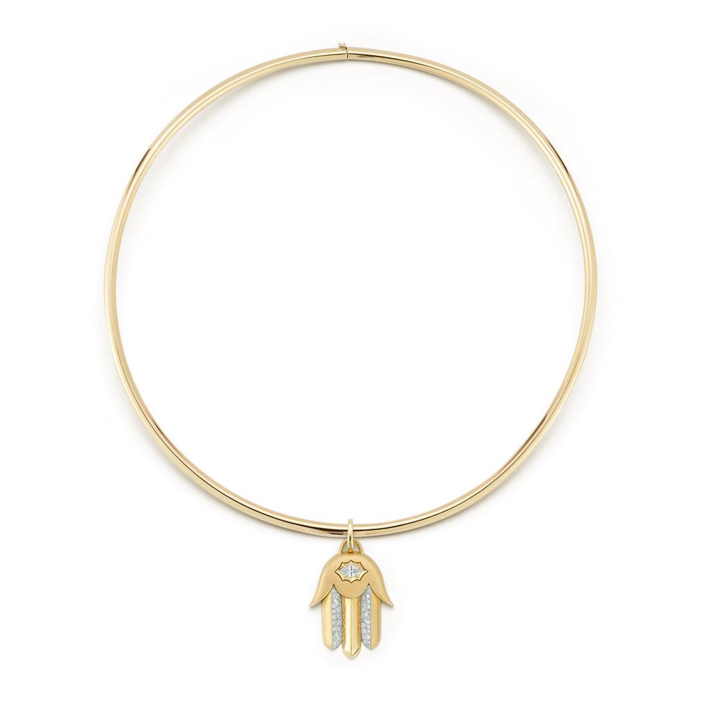 Изящные золотые торки этого дизайнера можно носить отдельно или в сочетании с одним из ее крупных анималистических или талисманных мотивов, например, с хамсой. У Джейд также есть колье-торки, украшенные бриллиантами в абстрактном цветочном узоре, что придает образу романтический оттенок.