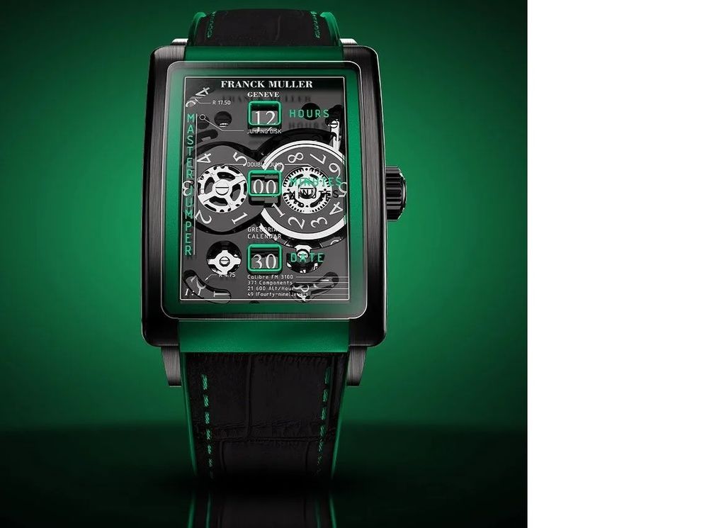 Трио новых часов Long Island Evolution от Franck Muller представляют собой разные варианты выражения времени. Выбирайте модель с 7-дневным запасом хода, турбийоном Giga или, как показано здесь, Master Jumper с усложнением в виде «прыгающих» часов. Все они выполнены в матовом титановом корпусе с зеленым анодированным безелем и соответствующей строчкой на ремешке.