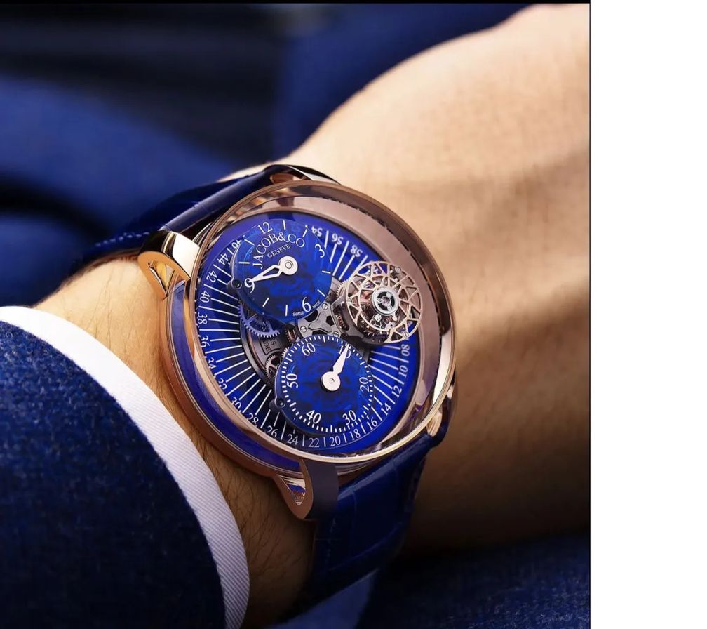 Новая модель Astronomia Regulateur из розового золота с синим – это новый взгляд Jacob & Co на часы-«регулятор», эпатажная феерия в виде трехмерного изображения небесного мира. Вращающийся механизм оснащен тремя модулями: один – для минутного парящего турбийона, другие – для часового и минутного вспомогательных циферблатов.