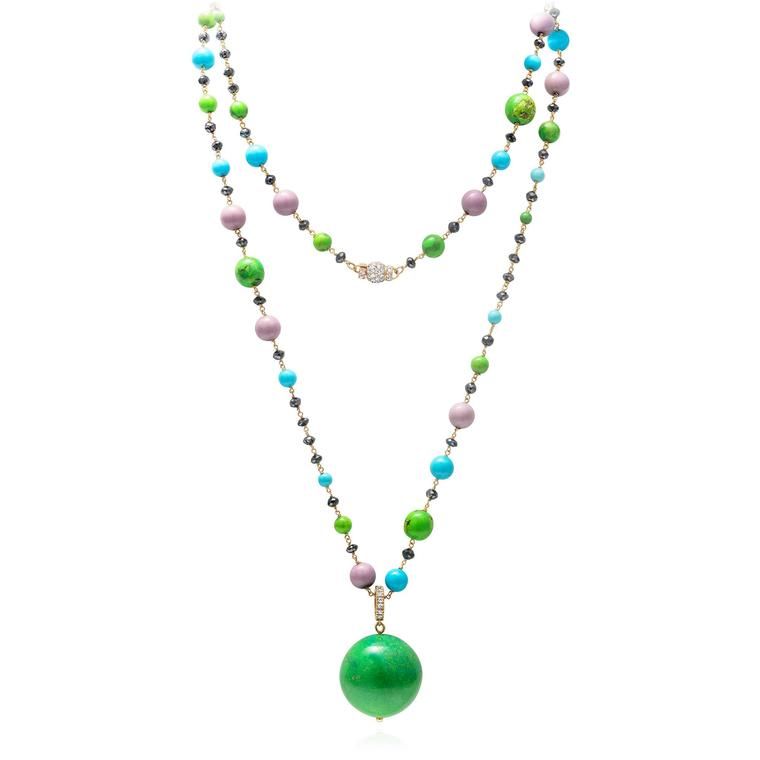 Колье Nereids Bead передает свежесть моря с помощью зеленых и голубых бирюзовых бусин, лавандовой яшмы и граненых черных бриллиантов в оправе из желтого золота. Это игривое сочетание форм и оттенков отражает любовь Карины к цвету и необычным сочетаниям драгоценных камней: