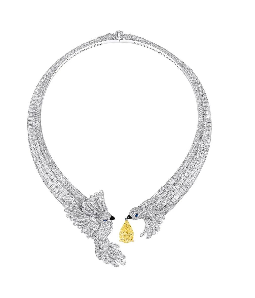 Воробей ассоциируется с греческой богиней любви, а изгиб колье, помимо бриллиантовых птиц, призван передать органическую форму бриллиантового пера.