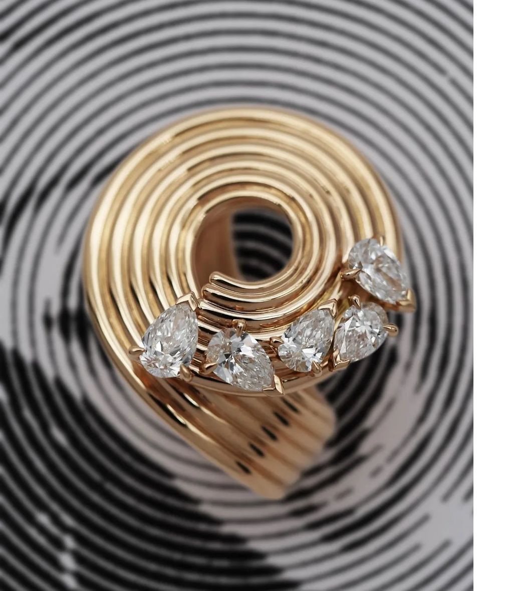 Последнее дополнение к коллекции Blast – не исключение. Кольцо Spiral представляет собой форму без конца и ссылается на круг лучей света и японскую философию Энсо, согласно которой дух не имеет ни начала, ни конца. В кольце пять бриллиантов грушевидной формы общим весом почти 2 карата, расположенных в разных направлениях на розовом золоте.