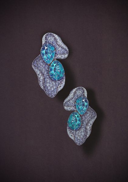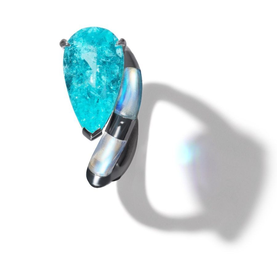 Катерина, в свою очередь, курировала различные Дома моды и независимых дизайнеров. «Дело никогда не было в выборе самых известных брендов, – говорит она. – Я искала изделия, в которых драгоценный камень использовался бы не только для блеска, но и был как душа дизайна». Для Катерины было также важно показать, что турмалин параиба используется в самых разных формах: ограненный, необработанный, резной.