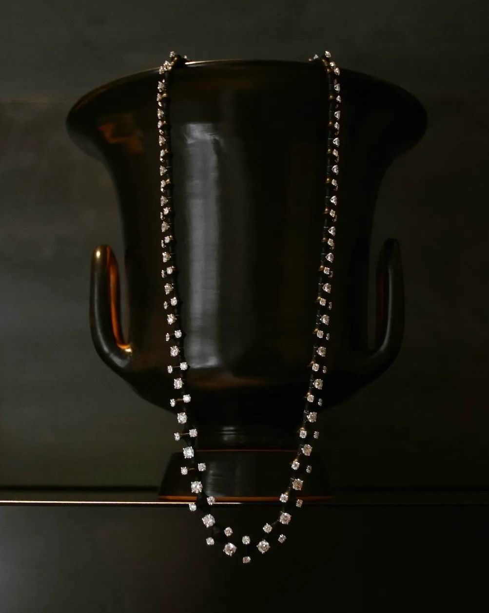 Коллекция Wish от Nikos Koulis. Черненое ожерелье с круглыми белыми бриллиантами весом 15,75 карата и бриллиантами огранки багет весом 6,46 карата: