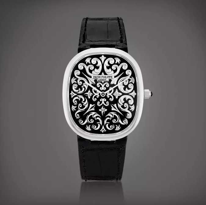 Patek Philippe | Ellipse, Reference 5738 | Лимитированная серия платиновых наручных часов с циферблатом из черной эмали с ручной гравировкой, изготовленных к 50-летию Golden Ellipse, около 2019 года: