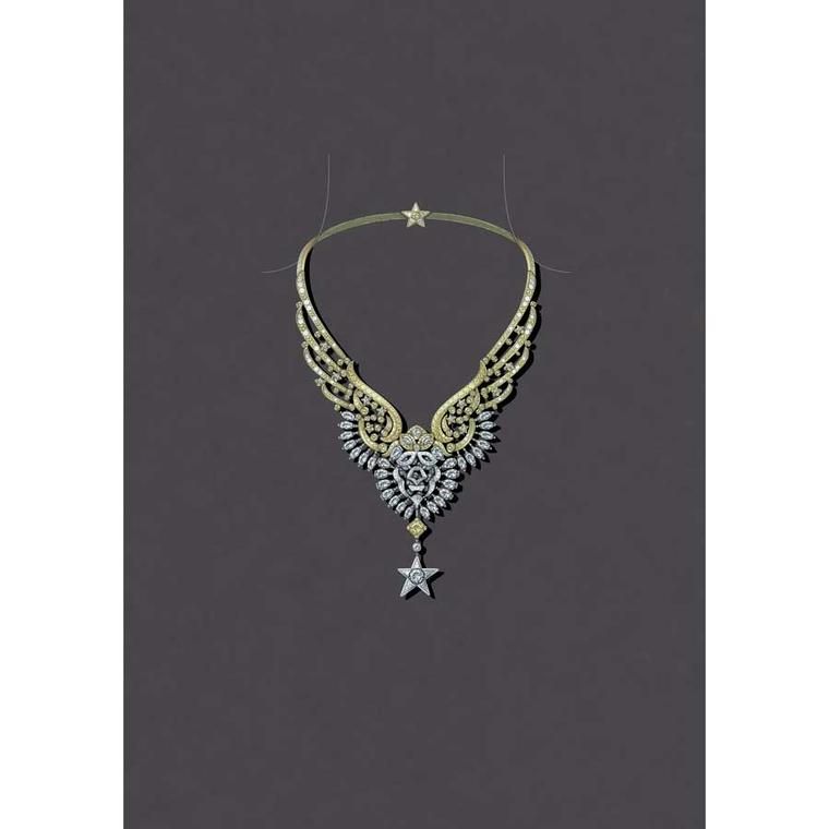 Колье Sky is the Limit объединяет все три мотива коллекции и представляет собой силуэт крылатого льва, сверкающего среди каскада бриллиантов и украшенного звездой.