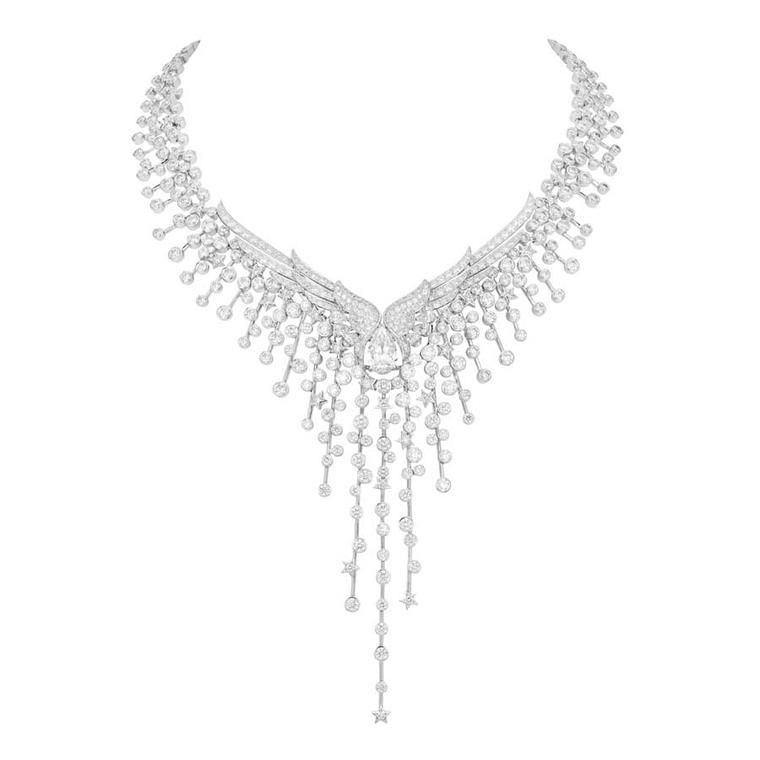 Бриллиант весом 3,11 карата окружен ослепительными крыльями и каскадами бриллиантов в колье Touch the Sky: