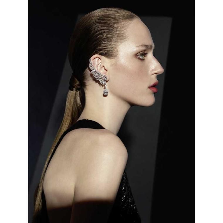 Украшение в виде крыльев отражает любовь Габриэль к перьям и их природной элегантности. Эти ажурные украшения легки, как кружево, и мягко ложатся на кожу благодаря сложным узорам и едва заметной оправе.
