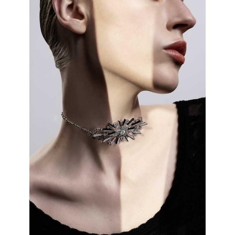 Чокер Dazzling Star придает мотиву кометы свежесть, украшенный тонкой цепочкой сверкающих бриллиантов и черным лаком: