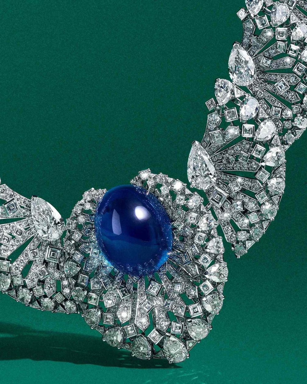 Колье Pavocelle украшено цейлонским сапфиром весом 58,08 карата и имеет очень объемную структуру: