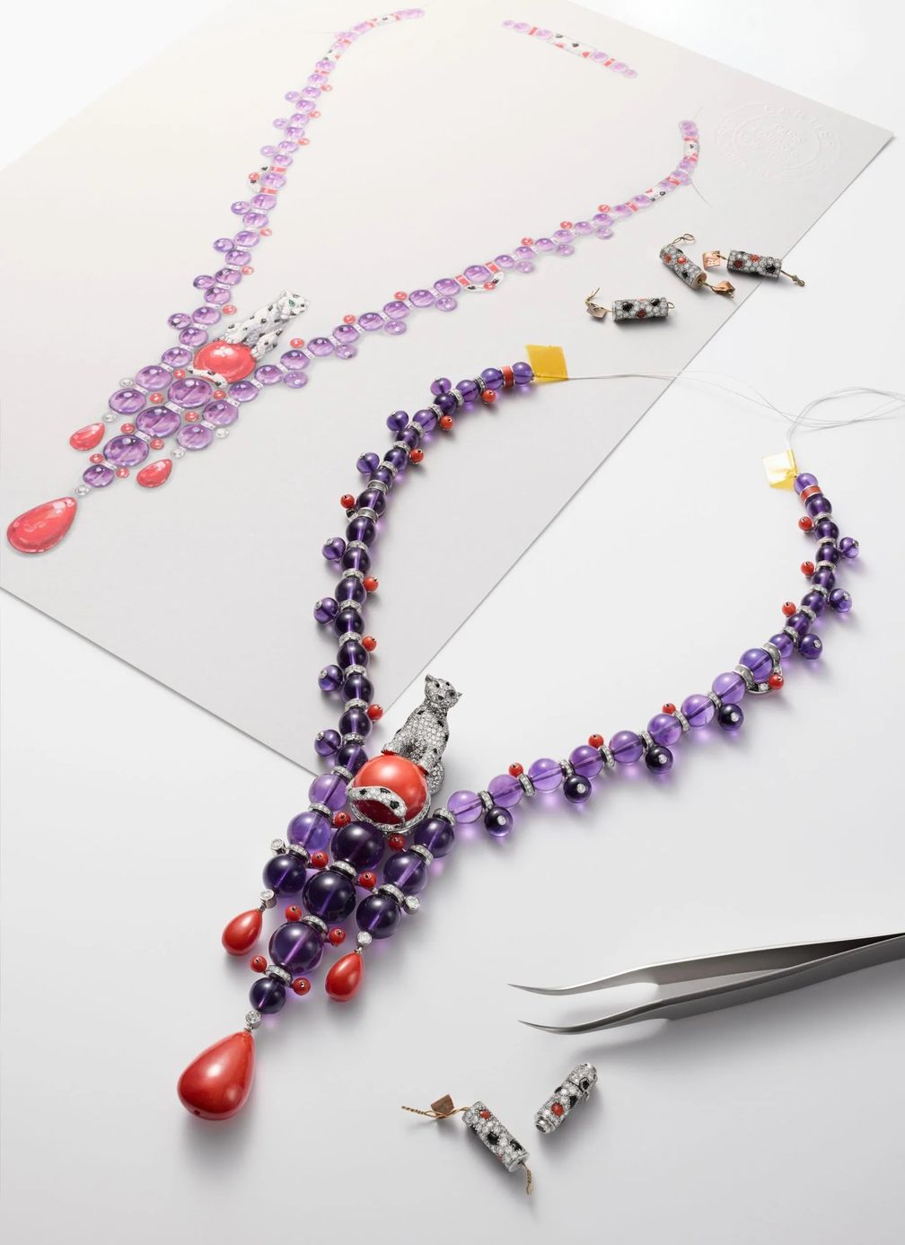 Это послужило элегантным и ярким фоном для некоторых из самых красочных драгоценностей коллекции En Équilibre. Одним из таких украшений стало колье Panthère Orbitale, выполненное в смелой палитре фиолетового и красного цветов. В центре композиции пантера грациозно восседает на коралле в форме кабошона, в обрамлении бусин из аметиста, которые напоминают небесные тела и планеты.