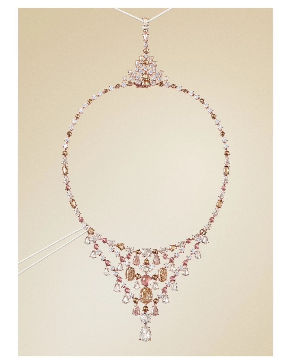 Не только яркие цвета могут произвести впечатление. Завораживающее своей утонченной элегантностью колье Hyala украшено сапфирами и бриллиантами нейтральных коричневых и светло-розовых тонов, которые идеально подчеркивают цвет кожи обладательницы. Между плавно соединяющимися слоями колье из розового золота, а также между камнями имеется пространство, позволяющее коже под ними органично вписаться в палитру мягких тонов.