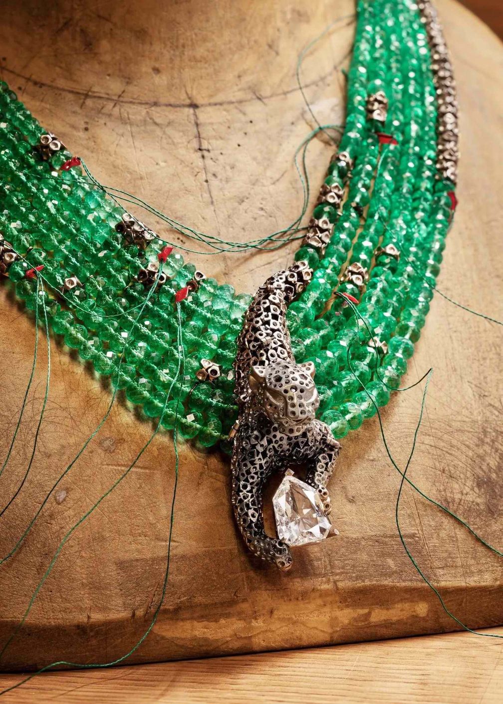 Для создания модели Panthère Dentelée, состоящей из нитей изумрудных бусин общим весом 274,58 карата и объемной пантеры, которая, похоже, крадется по этим бусинам, потребовалось 1 678 часов ручной работы. Наблюдая за мастерами, демонстрирующими свою работу, стало ясно, почему процесс изготовления этого ожерелья занимает так много времени.