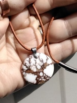 Подвески с магнезитом органично смотрятся на серебряных, медных цепочках разного плетения, а также на кожаных шнурках