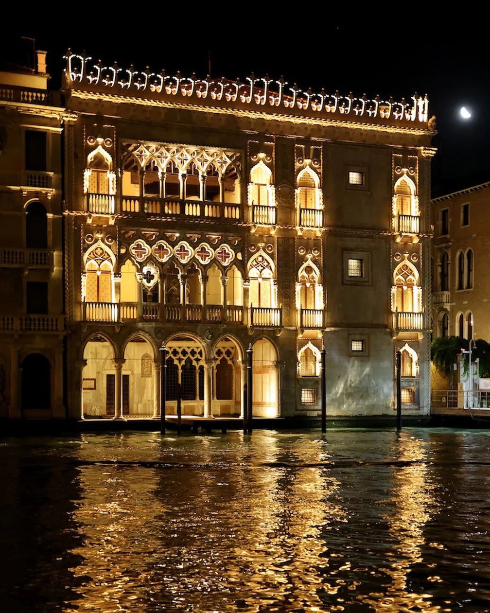 Дворец, построенный в середине 15 века, величественно расположился на Гранд-канале Венеции и известен своим безупречным ажурным мраморным фасадом, который в прошлом был частично позолочен, что дало ему прозвище «Золотой дом».