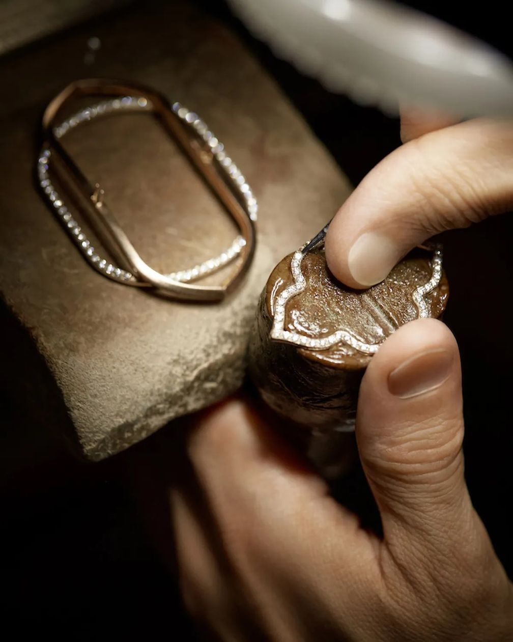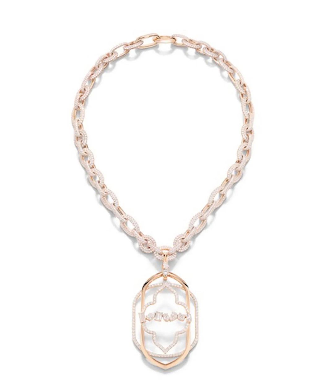 Подвеска из розового золота состоит из трех геометрических фигур, в которые в линию вставлены семь бриллиантов фантазийной формы, символизирующих симметрию дворца и журчащие воды Гранд-канала. Уникальное изделие закреплено на цепочке, украшенной 4 000 бриллиантами ручной огранки, которые гарантируют сияние.