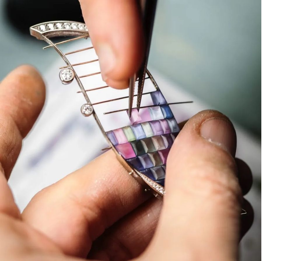 В этой мастерской работники усовершенствовали технику Mystery Set, необычную технику, изобретенную в Van Cleef & Arpels, которая позволяет крепить драгоценные камни к ювелирным изделиям без видимых зубцов или креплений.