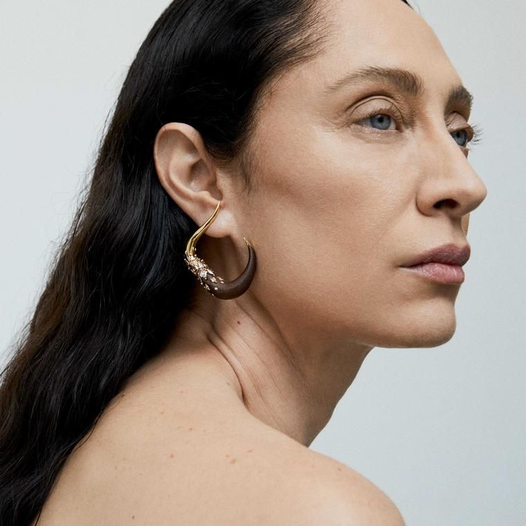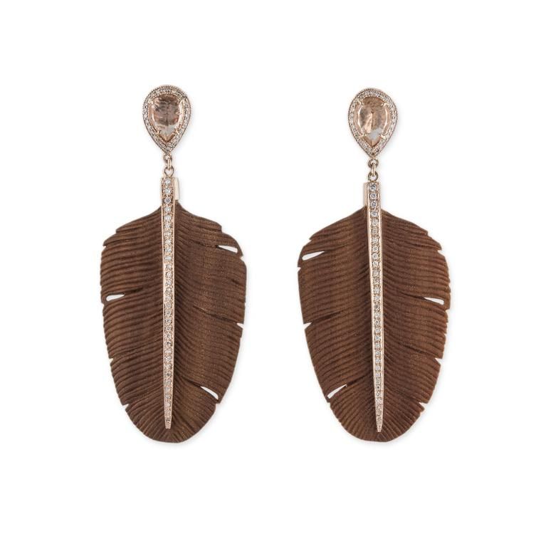 Не менее темное эбеновое дерево французский ювелир Мари Лихтенберг использует для создания стильных подвесок, в том числе в виде дракона, а калифорнийский ювелир Джеки Айше придает воздушную легкость серьгам из палисандра, вырезая перья и украшая их розовым золотом и морганитами.