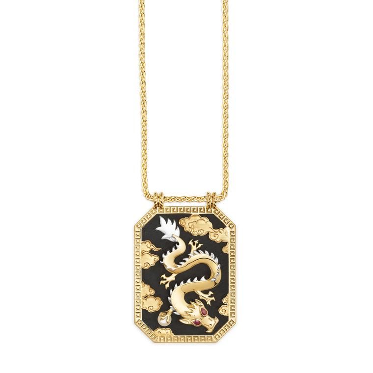 Эбеновое дерево эффектно подчеркивает золотого китайского дракона с рубиновыми глазами в подвеске Мари Лихтенберг: