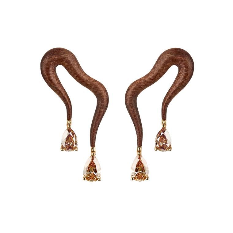Серьги из амазонского красного дерева лауро, украшенные двумя коричневыми бриллиантами, из коллекции Deep Stream от Fernando Jorge: