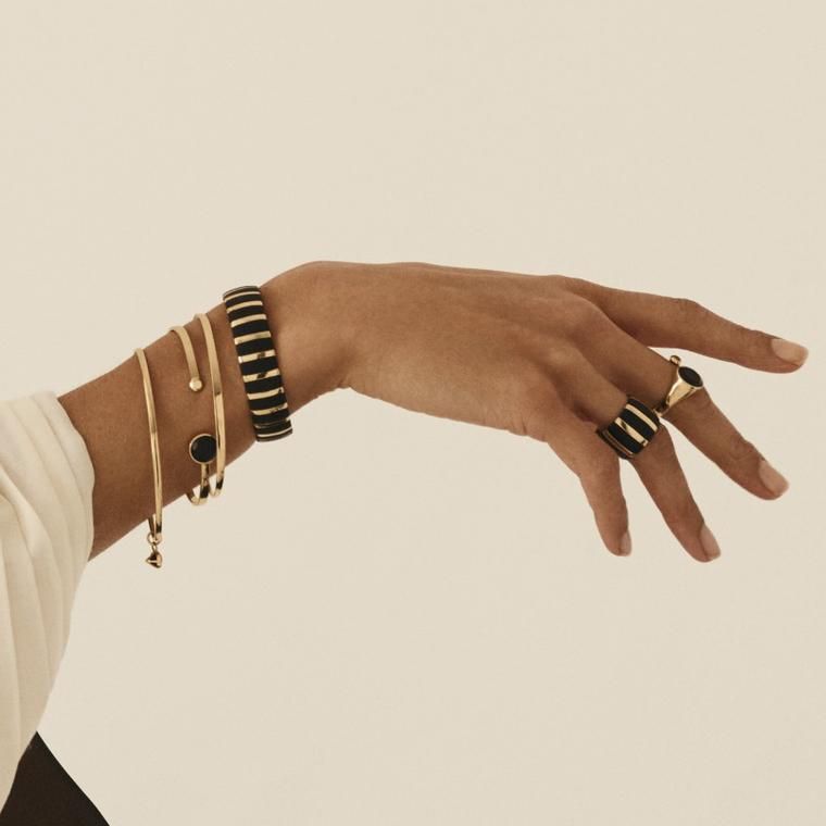 Экологически чистое дерево мпинго, которое обычно используется в музыкальных духовых инструментах, может быть огранено как драгоценный камень в золотых браслетах и кольцах от Kinraden: