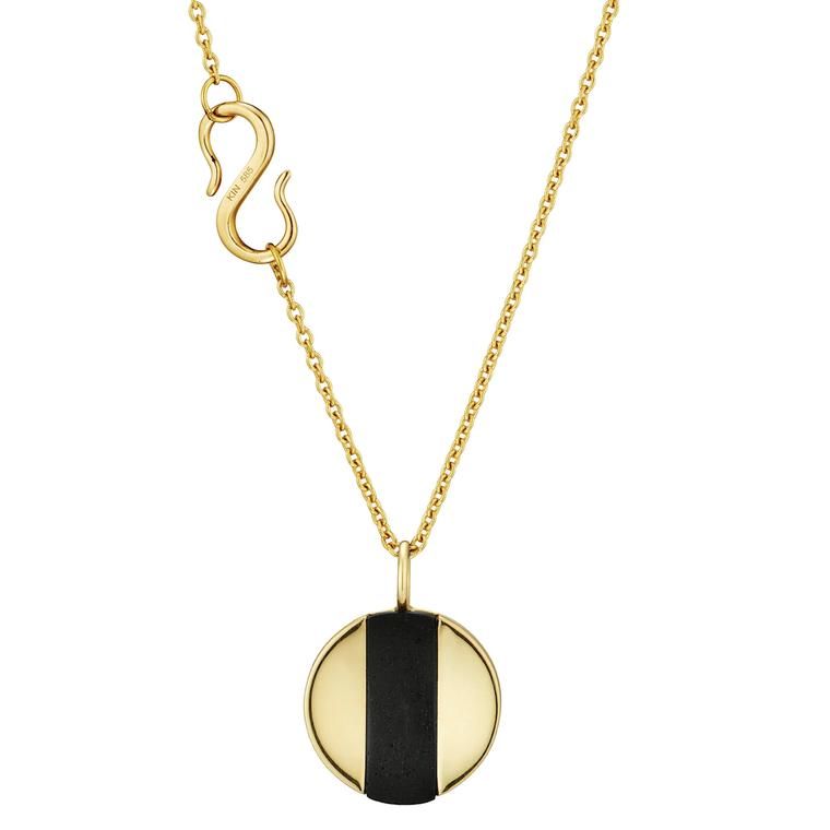 Это колье от Kinraden создано из переработанного 18-каратного золота и экологически чистого черного дерева мпинго из леса, сертифицированного FSC: