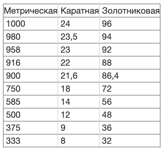 56-я проба означала 56 золотников чистого золота в 96 — то есть около 583,3 ‰.