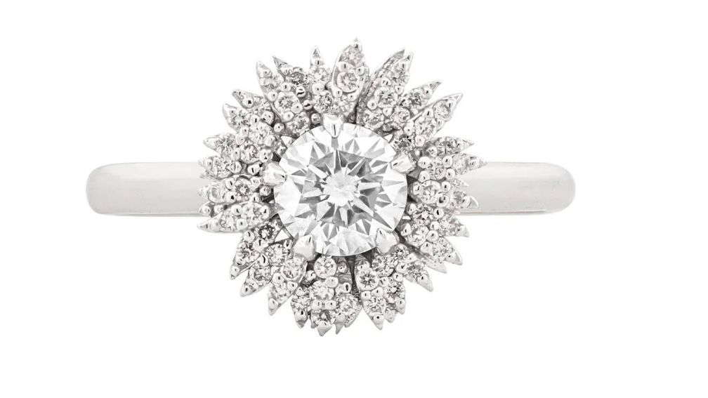 Кольцо Bernard James Flora с бриллиантами воспевает подсолнух, состоящий из лепестков с бриллиантами рavé и крупного круглого бриллианта в центре.