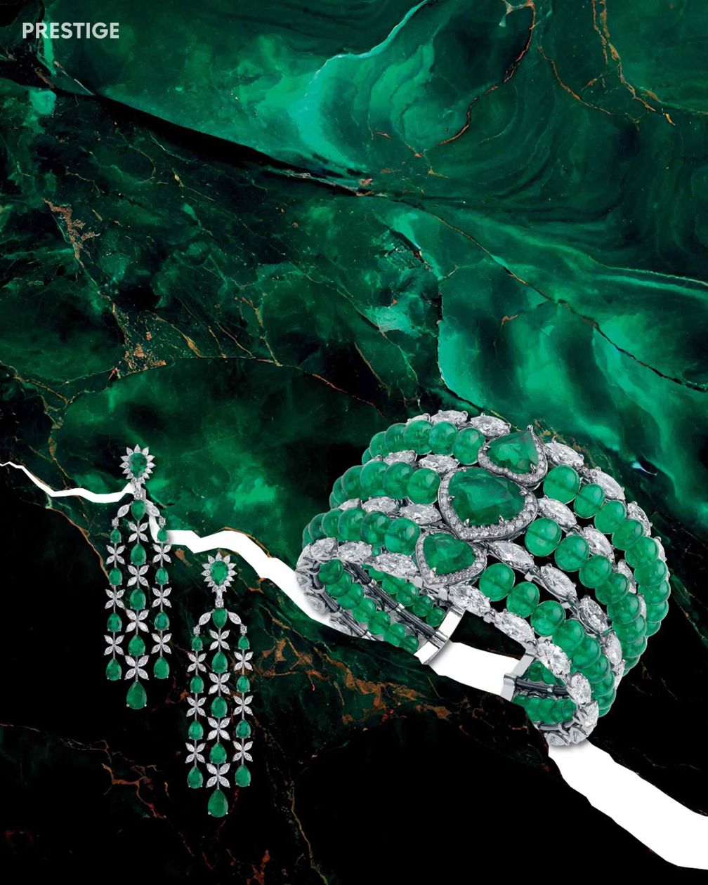 Причуды и чудеса наполняют коллекцию Contes de Fées от Chopard, вдохновленную сказками. Трио изумрудов огранки сердце занимает центральное место среди изумрудных бусин и бриллиантов в браслете из белого золота. Серьги-люстры очаровывают изумрудами грушевидной формы и бриллиантами.