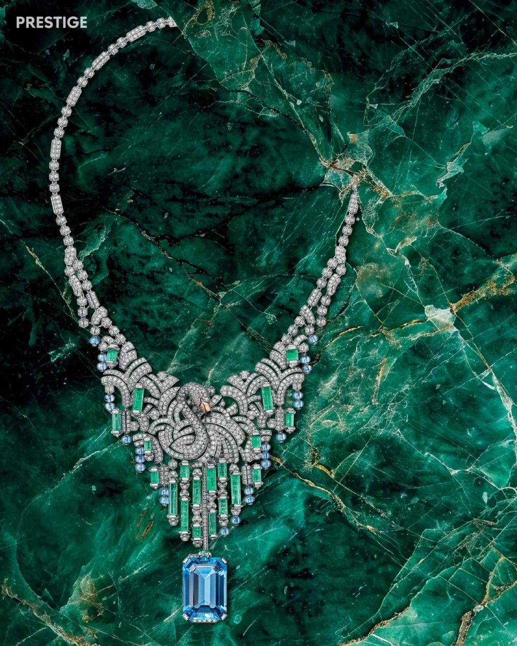 Изюминкой коллекции Nature Sauvage от Cartier стало колье Celestun из платины. Украшенный бриллиантами фламинго красуется в центре композиции, состоящей из изумрудных «тростников» и «пруда» из аквамаринов, включая аквамарин весом 38,5 карата в центре.